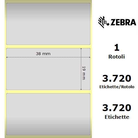 Etichette Zebra a bobina. 1 bobina per confezione. 3720 etichette per bobina. Etichette in poliestere con adesivo permanente. Diametro interno: 25 mm. Diametro esterno: 127 mm.