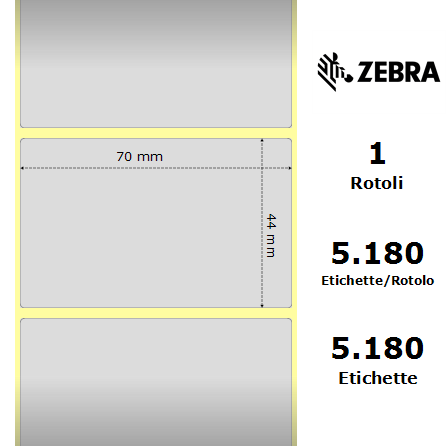 Etichette Zebra a bobina. 1 bobina per confezione. 5180 etichette per bobina. Etichette in poliestere con adesivo permanente. Diametro interno: 76 mm. Diametro esterno: 200 mm.