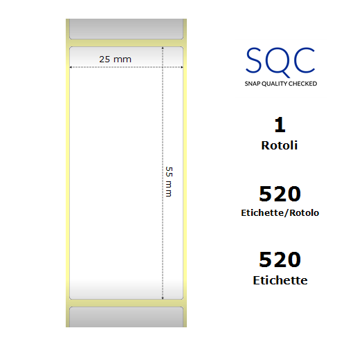Etichette SQC a bobina. 1 bobina per confezione. 520 etichette per bobina. Etichette in carta con adesivo permanente. Diametro interno: 25 mm. Diametro esterno: 82 mm.