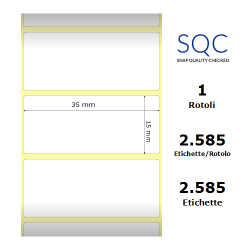 Etichette SQC a bobina. 1 bobina per confezione. 2585 etichette per bobina. Etichette in carta con adesivo permanente. Diametro interno: 40 mm. Diametro esterno: 102 mm.