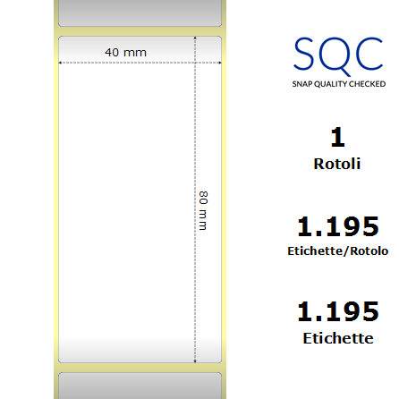 Etichette SQC a bobina. 1 bobina per confezione. 1195 etichette per bobina. Etichette in carta con adesivo permanente. Diametro interno: 40 mm. Diametro esterno: 146 mm.