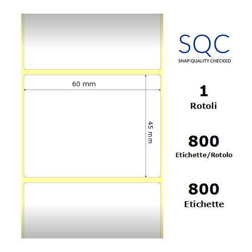Etichette SQC a bobina. 1 bobina per confezione. 800 etichette per bobina. Etichette in carta con adesivo permanente. Diametro interno: 25 mm. Diametro esterno: 90 mm.