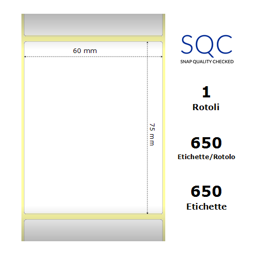 Etichette SQC a bobina. 1 bobina per confezione. 650 etichette per bobina. Etichette in carta con adesivo permanente. Diametro interno: 40 mm. Diametro esterno: 108 mm.