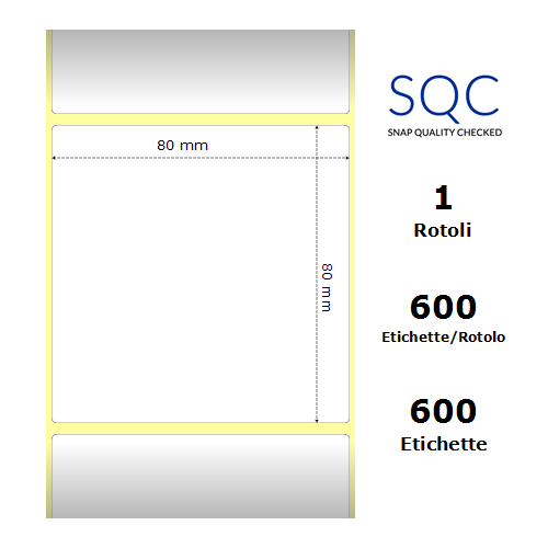 Etichette SQC a bobina. 1 bobina per confezione. 600 etichette per bobina. Etichette in carta con adesivo permanente. Diametro interno: 25 mm. Diametro esterno: 102 mm.