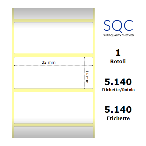 Etichette SQC a bobina. 1 bobina per confezione. 5140 etichette per bobina. Etichette in carta con adesivo permanente. Diametro interno: 25 mm. Diametro esterno: 127 mm.