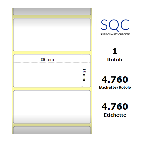 Etichette SQC a bobina. 1 bobina per confezione. 4760 etichette per bobina. Etichette in carta con adesivo permanente. Diametro interno: 25 mm. Diametro esterno: 127 mm.