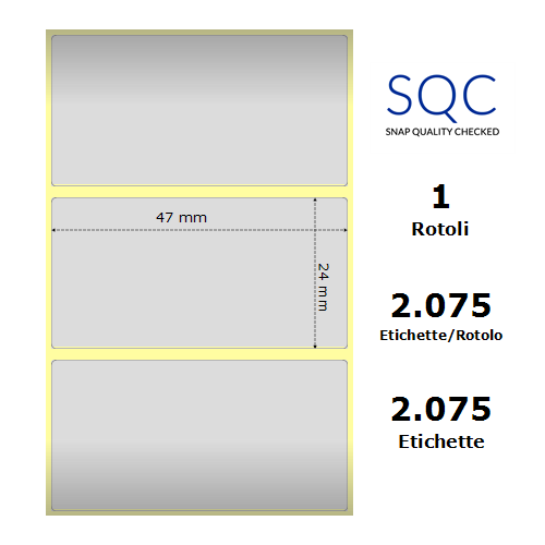 Etichette SQC a bobina. 1 bobina per confezione. 2075 etichette per bobina. Etichette in poliestere con adesivo permanente. Diametro interno: 40 mm. Diametro esterno: 103 mm.